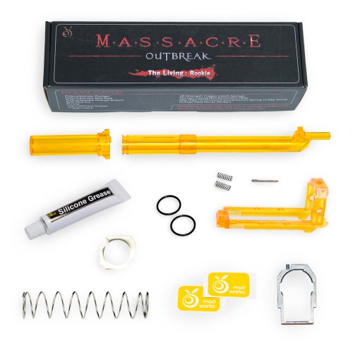 The Massacre kit contains a variety of replacement parts, some crafted out of metal alloy, others out of strong polycarbonate plastic. The stronger spring and improved dart seal greatly increase the blaster's muzzle velocity as well as its firing range, while simultaneously reinforcing the remaining internal parts to withstand the increased spring tension. WARNING - Some of our products may contain plastic wrapping and small metal parts that could present a choking hazard in young children. Product not intended for children under 8 years of age. Increasing the firing velocity of your blaster can result in injuries if not used with the proper respect. Have fun, but remember to use your blaster responsibly. Neither Orange Mod Works nor Hasbro, Inc.