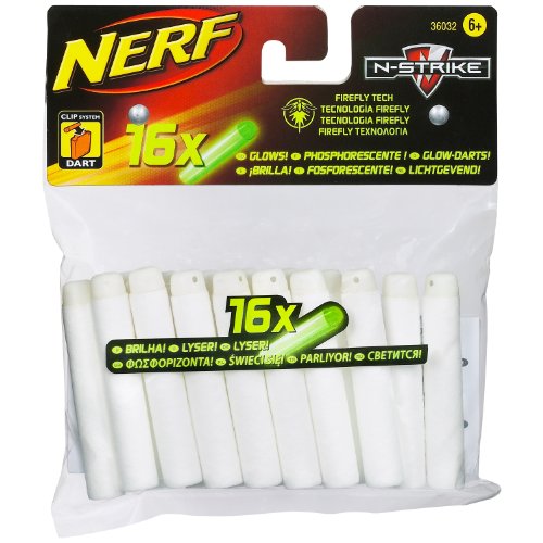Get the ammo you need for night battles with this awesome 16-dart pack of glow-in-the-dark darts! These darts work with the Firefly Tech magazine (sold separately) that charges glow-in-the-dark darts. Load up with these darts for incredible after-dark action! 6 Years +