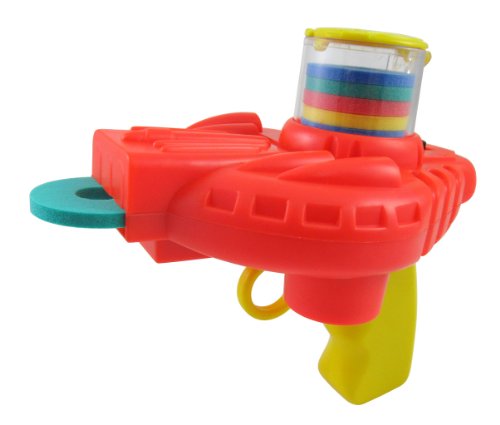 Rapidly fire soft discs with this vintage battery operated soft disc shooter. 12 safe soft foam discs are included. This disc launcher has rev up sounds and discs can be fired rapidly one after the other. This disc launcher measures 7" long. 2 AA batteries required (not included). Fun and safe for the family!