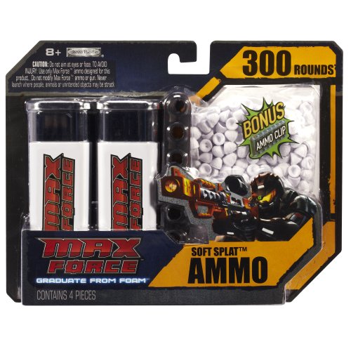300 rounds of soft splat ammo works with ALL Max Force Guns! Delivering Max Distance, Max Accuracy and Max Tagging. Aerodynamic Ammo is designed for safety & performance and biodegradable. Easy to clean up - just wipe away! Also is Non Staining. Includes 2 Ammo Containers AND a BONUS 8 ROUND AMMO CLIP!